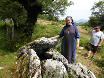 Sister Guadalupe of the monastery of Zamartze examining a prehistoric dolmen tomb on the hillside nearby (Fran Valle in background)